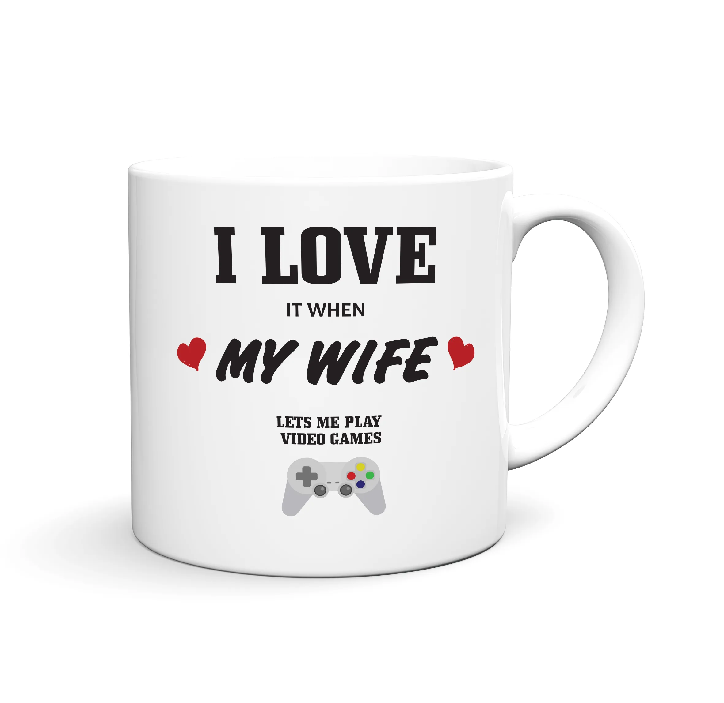 Razveselite svoje najbližje z zabavnim in veselim motivom I LOVE IT WHE MY WIFE LET ME PLAY GAMES Natisnemo ga lahko na katerikoli izbran izdelek keramične in emajlirane skodelice, termo steklenice za vodo, hranilnike ali šparovčke… in dodamo želeno ime.