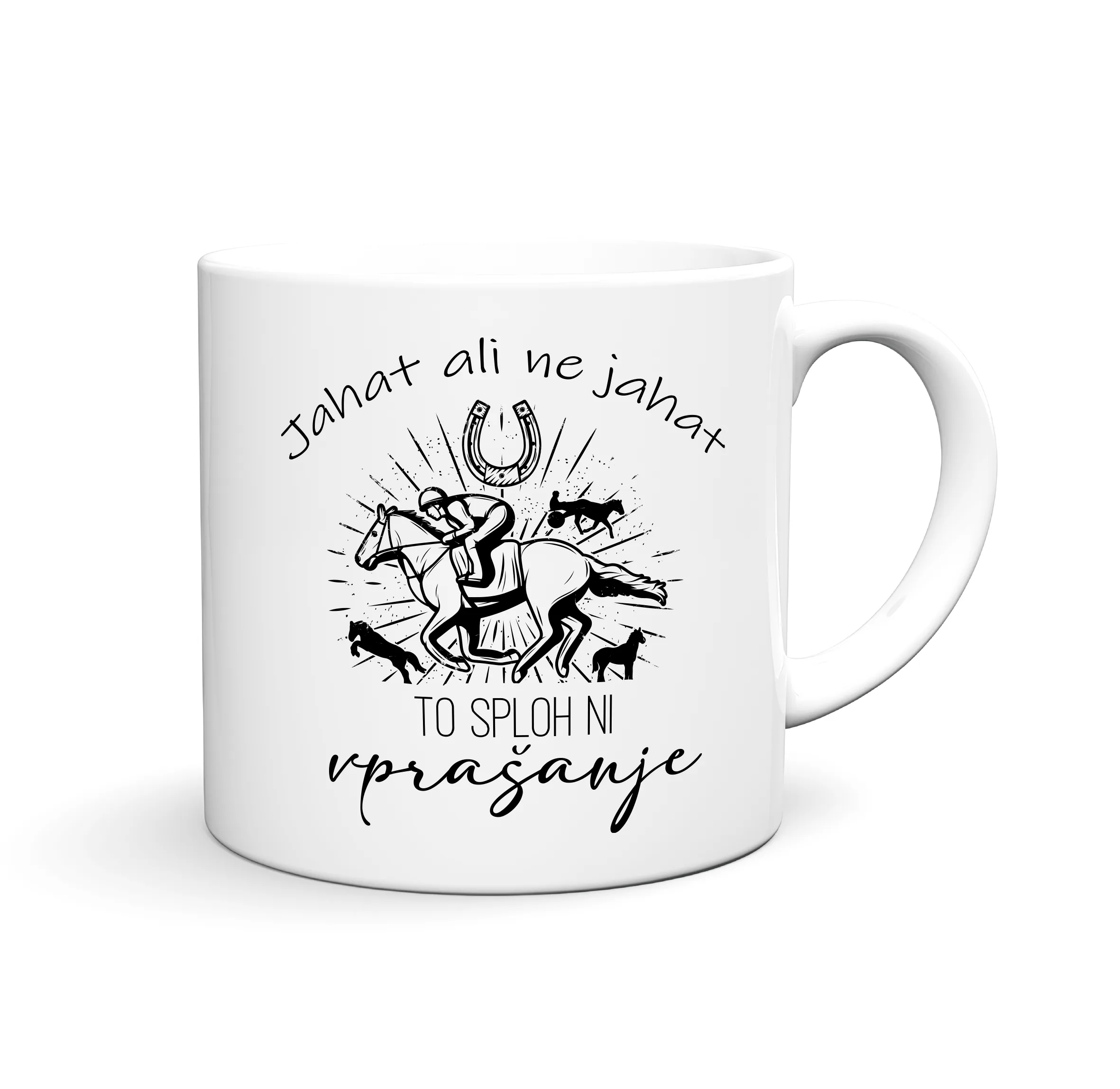 Razveselite svoje najbližje z zabavnim motivom JAHAT ALI NE JAHAT TO SPLOH NI VPRAŠANJE…Natisnemo ga lahko na katerikoli izbran izdelek keramične in emajlirane skodelice, termo steklenice za vodo, hranilnike ali šparovčke… in dodamo želeno ime. Motiv je natisnjen na skodelico ali na levi in desni strani, vrčku na sredini, steklenicah pa spredaj in zadaj.
