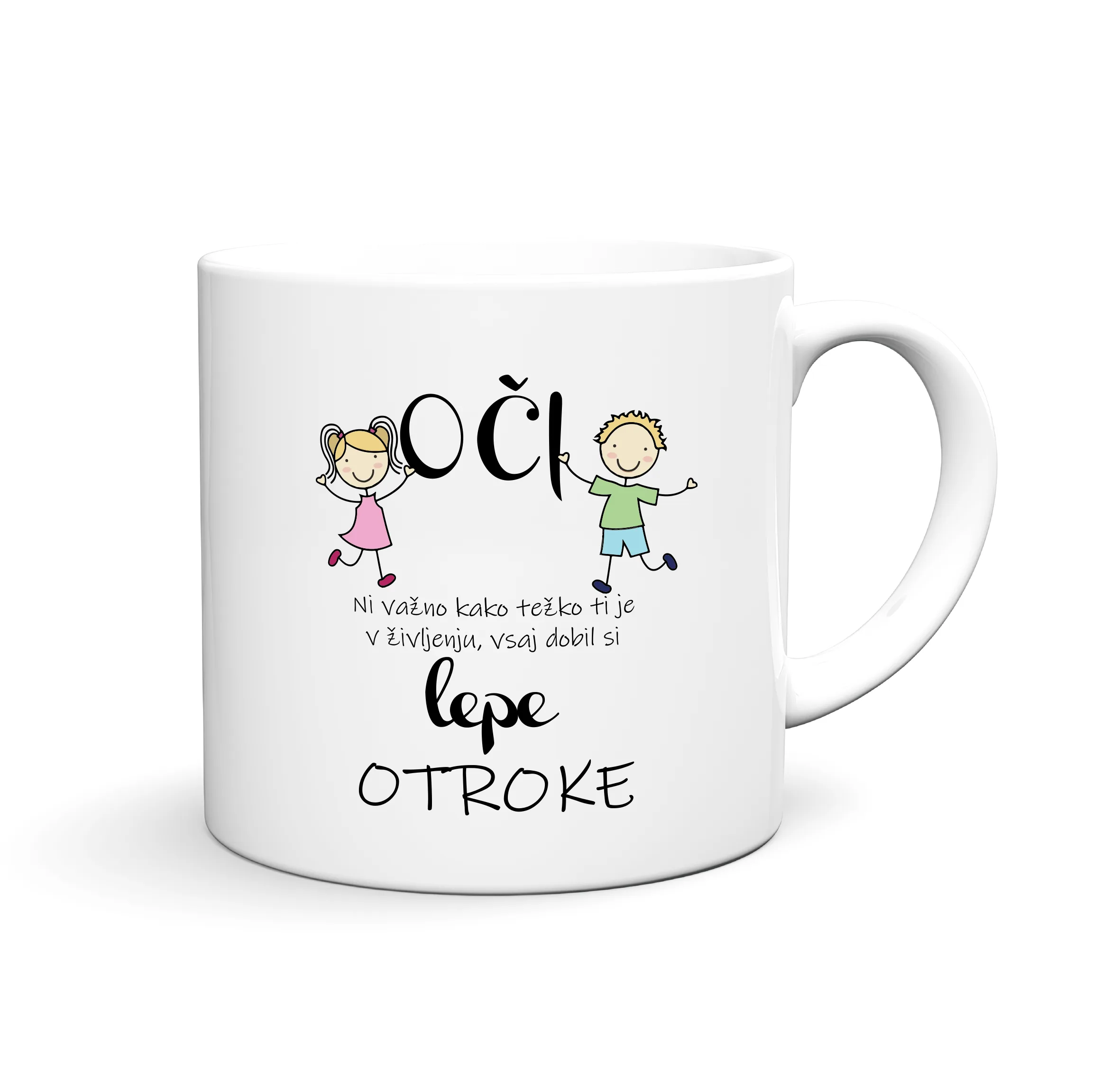 Razveselite svoje najbližje z zabavnim in veselim motivom OČI NI VAŽNO KAKO TEŽKO TI JE V ŽIVLJENJU, VSAJ DOBIL SI LEPE OTROKE… Natisnemo ga lahko na katerikoli izbran izdelek keramične in emajlirane skodelice, termo steklenice za vodo, hranilnike ali šparovčke… in dodamo želeno ime.