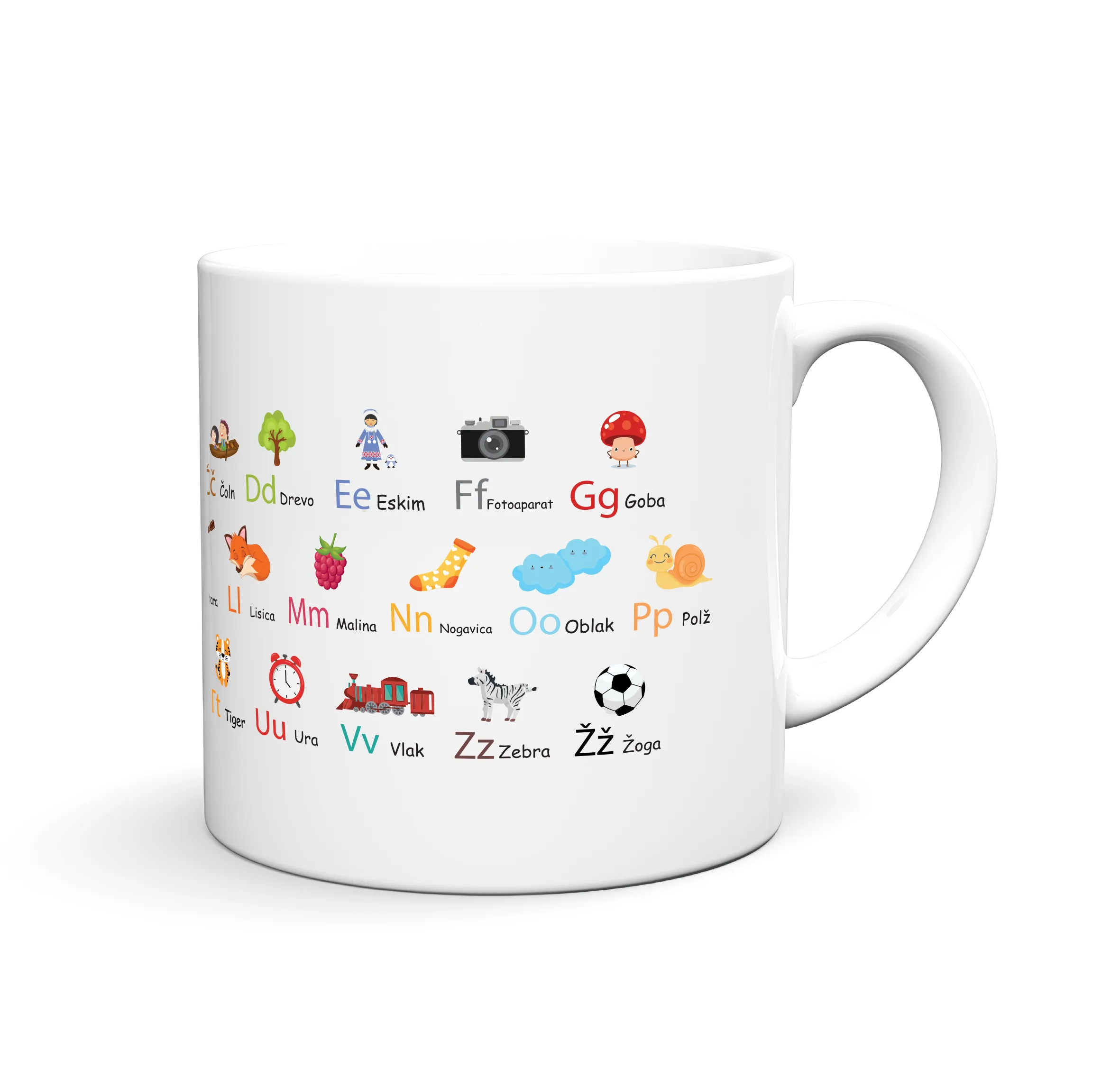 Razveselite svoje najmlajše z zabavnim in poučnim motivom otroške abecede . Natisnemo ga lahko na katerikoli izbran izdelek keramične in emajlirane skodelice, termo steklenice za vodo, hranilnike ali šparovčke… in dodamo želeno ime.