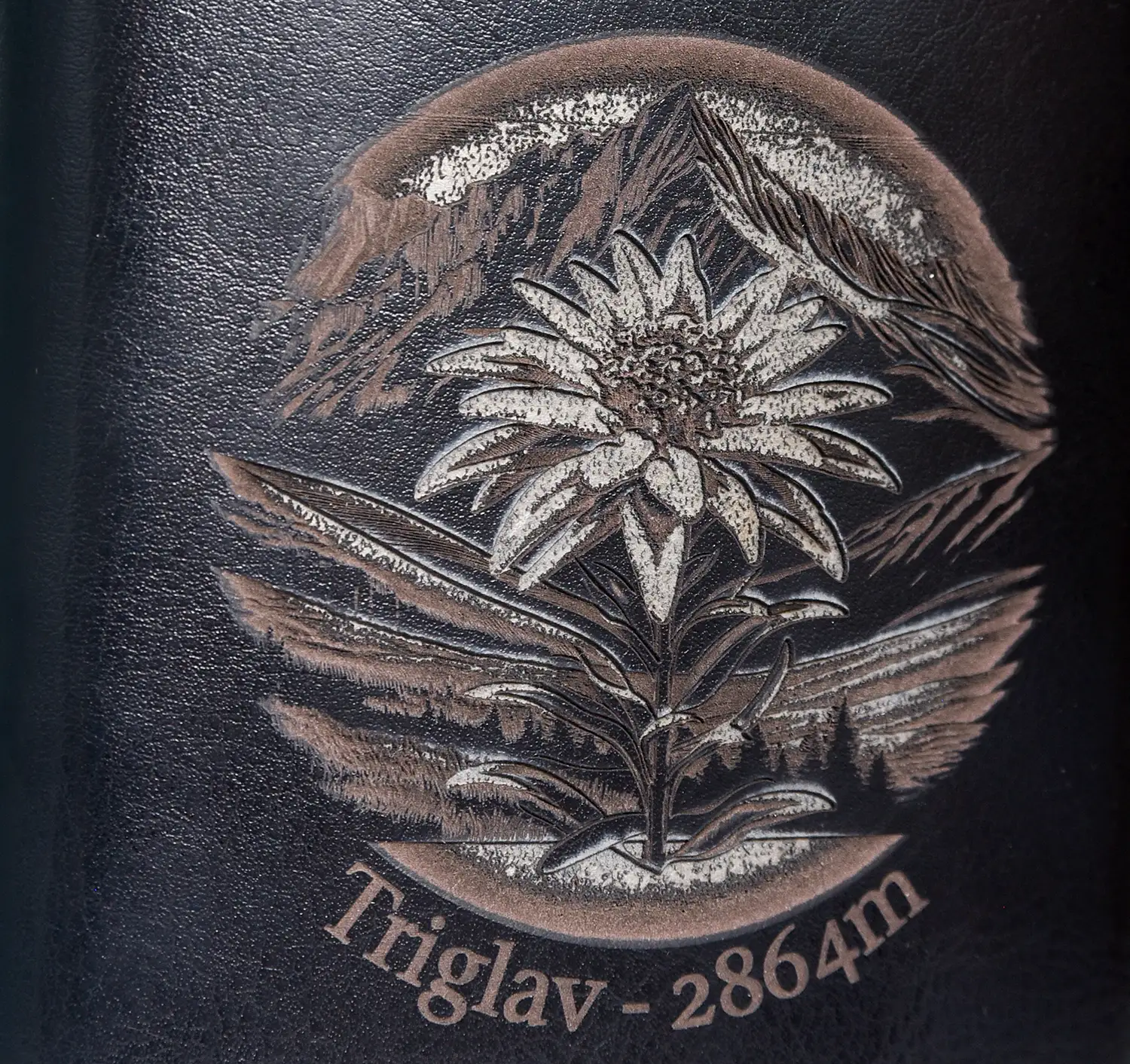 Motiv: lasersko graviran Triglav, planika in gorska panorama