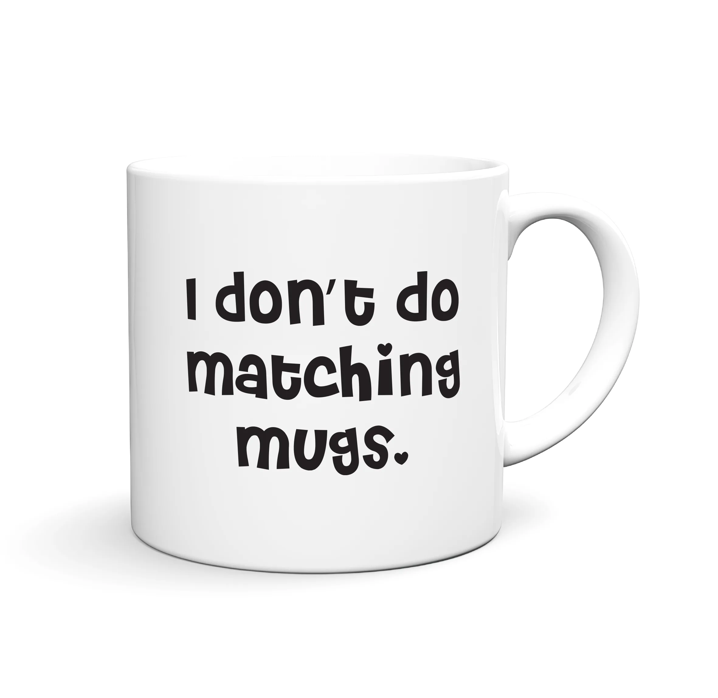 Razveselite svojo ljubezen z zabavnim motivom I DON’T DO MATCHING MUGS…Natisnemo ga lahko na katerikoli izbran izdelek keramične in emajlirane skodelice, termo steklenice za vodo, hranilnike ali šparovčke… in dodamo želeno ime. Motiv je natisnjen na skodelico ali na levi in desni strani, vrčku na sredini, steklenicah pa spredaj in zadaj.