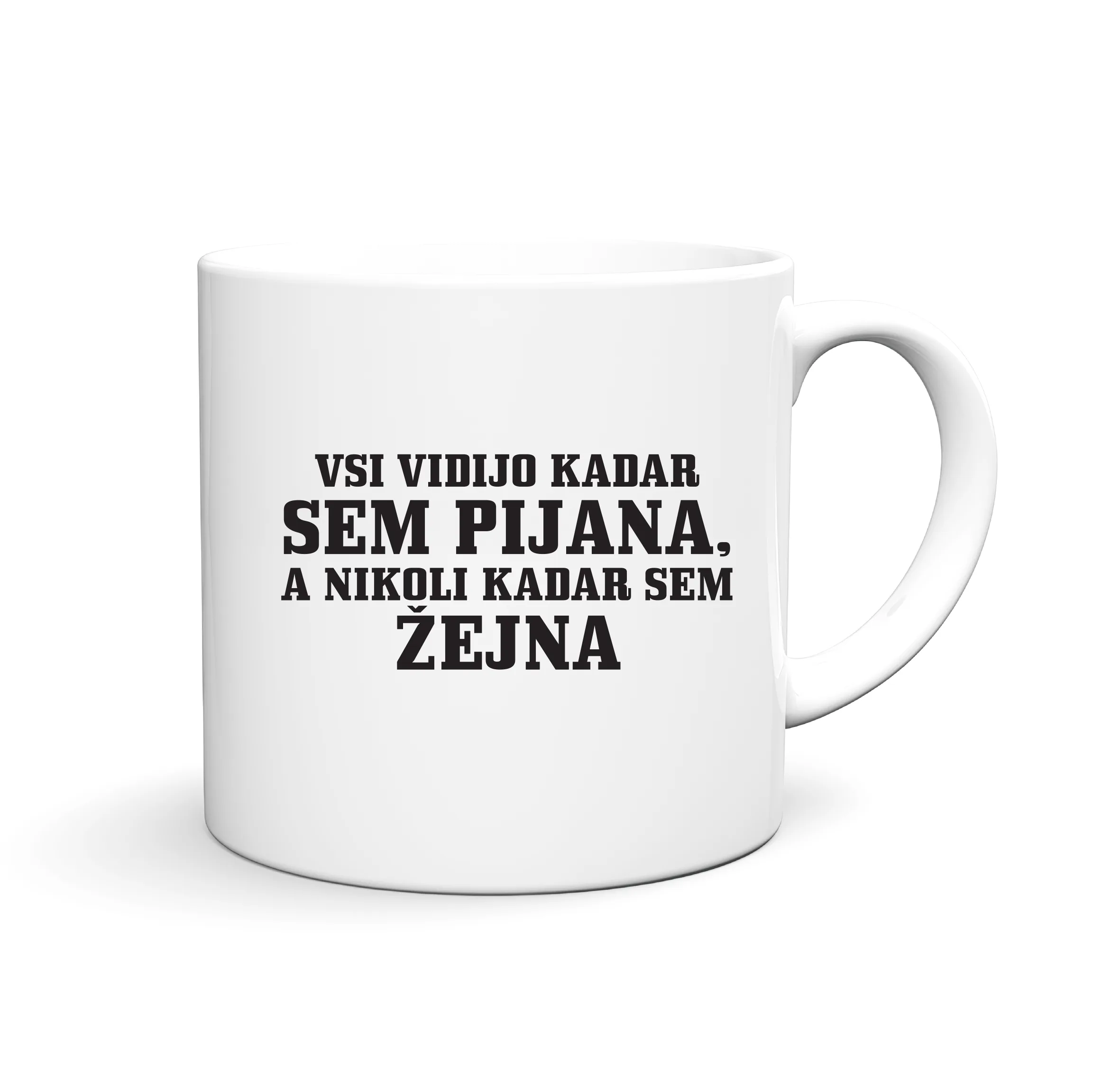 Razveselite svoje najbližje z zabavnim in veselim motivom VSI VIDIJO KADAR SEM PIJANA Natisnemo ga lahko na katerikoli izbran izdelek keramične in emajlirane skodelice, termo steklenice za vodo, hranilnike ali šparovčke… in dodamo želeno ime. Motiv je natisnjen na skodelico ali na levi in desni strani, vrčku na sredini, steklenicah pa spredaj in zadaj.